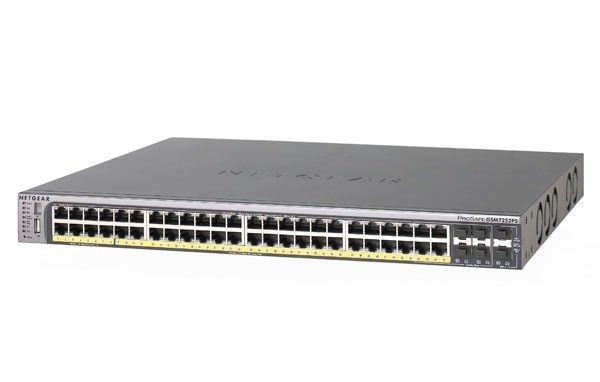 NETGEAR Stackable, PoE Managed Gigabit Switches GSM7228PS and GSM7252PS allow the most fl exible and easy-to-deploy Gigabit Power over Ethernet infrastructure. All the 24 and 48 ports of 10/100/1000 Mbps interfaces support 802.3af PoE standard with a comfortable 384 Watts total budget. The fi rst 8 ports support high power 802.3at PoE+, with up to 30 Watts per port. Four (SFP) Gigabit interfaces provide optional fi ber connectivity for longer reach Gigabit Ethernet requirements. Two built-in 10 Gigabit Ethernet SFP+ interfaces on the front, reserved for network uplinks or servers and storage devices, and two 10 Gigabit module bays on the rear, permitting both uplinks and local/distant stacking, provide versatile 10 Gigabit deployment possibilities.